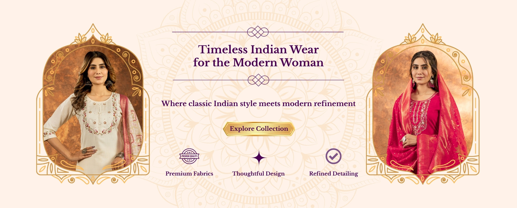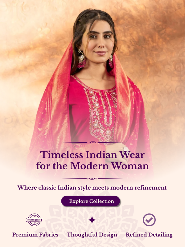 Each piece is crafted with premium fabrics, refined detailing, and thoughtfully curated designs inspired by India's rich heritage. From flawless fits to superior finishing, every outfit reflects our commitment to quality, authenticity, and effortless style-made for women who value elegance in every moment.